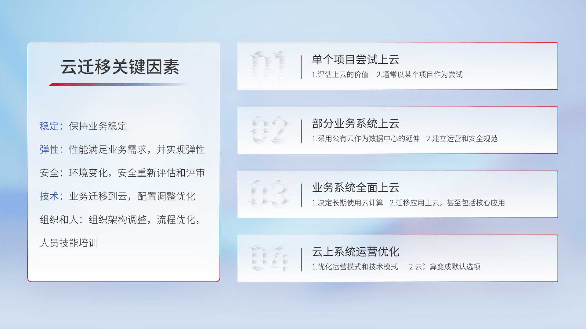 结合实际业务,,,,从规划设计、、、、云平台选型、、、云原生改造、、数据迁移、、、、集成交付,,,迁移全过程为客户识别最佳上云路径,,做好风险识别管理,,,设计网络架构、、身份权限、、安全审计合规、、操作审计、、、日志审计、、、监控告警策略、、、多站点容灾设计等,,对云上基础设施进行整体规划,,,,提升IT治理水平,,,以满足弹性、、高可用、、、高性能的需求。。。